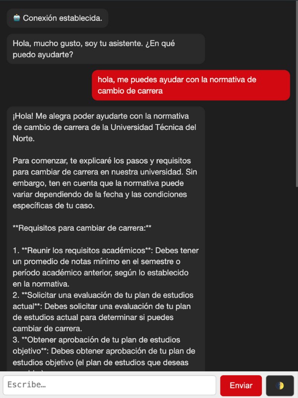 Abstract: El acceso a la normativa de la Facultad de Ingeniería en Ciencias Aplicadas (FICA) de la Universidad Técnica del Norte suele ser un proceso poco eficiente, dado que estudiantes y docentes deben revisar manualmente documentos extensos, lo que dificulta obtener información específica de manera rápida y confiable. Para abordar esta cuestión, este trabajo propone la creación de un asistente virtual fundamentado en un modelo lingüístico de gran tamaño (LLM), al que se le reentrenará utilizando técnicas de fine-tuning, para así ofrecer respuestas precisas y contextualizadas a preguntas sobre la normativa institucional. El modelo CRISP-DM fue el método utilizado, lo que posibilitó construir de manera sistemática las etapas de entendimiento, recolección, limpieza y ordenamiento de los datos normativos en un corpus que es compatible con el proceso de entrenamiento. de fine-tuning, adecuando el modelo base al ámbito particular de la normativa universitaria y optimizando su rendimiento en trabajos de respuesta a preguntas, los hallazgos demuestran que el asistente virtual puede producir respuestas coherentes y en tiempo real, mejorando de manera significativa la consulta de normativas por la comunidad universitaria. En síntesis, el prototipo es una contribución innovadora en el ámbito académico porque no solo actualiza la forma de acceder a información normativa, sino que además sienta las bases para la creación de futuros sistemas de soporte institucional fundamentados en inteligencia artificial.